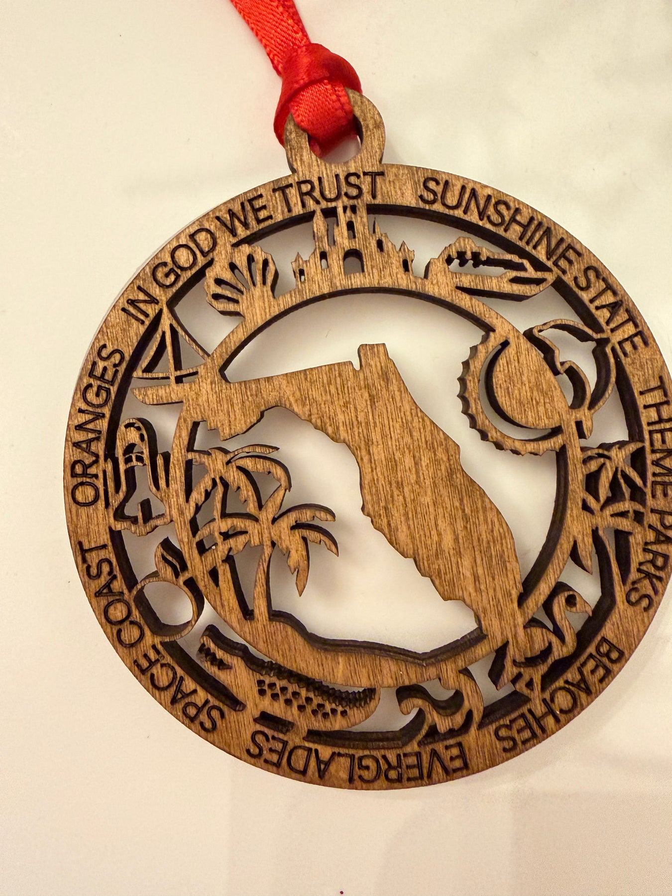 fEach piece is 3.25” wide and crafted from laser-cut wood with a double-layer design featuring a frosted acrylic backing that adds subtle dimension and shimmer. The top wood layer showcases Florida’s iconic outline surrounded by words that capture its charm — Space Coast, Everglades, Oranges, Beaches, Parks, and more.