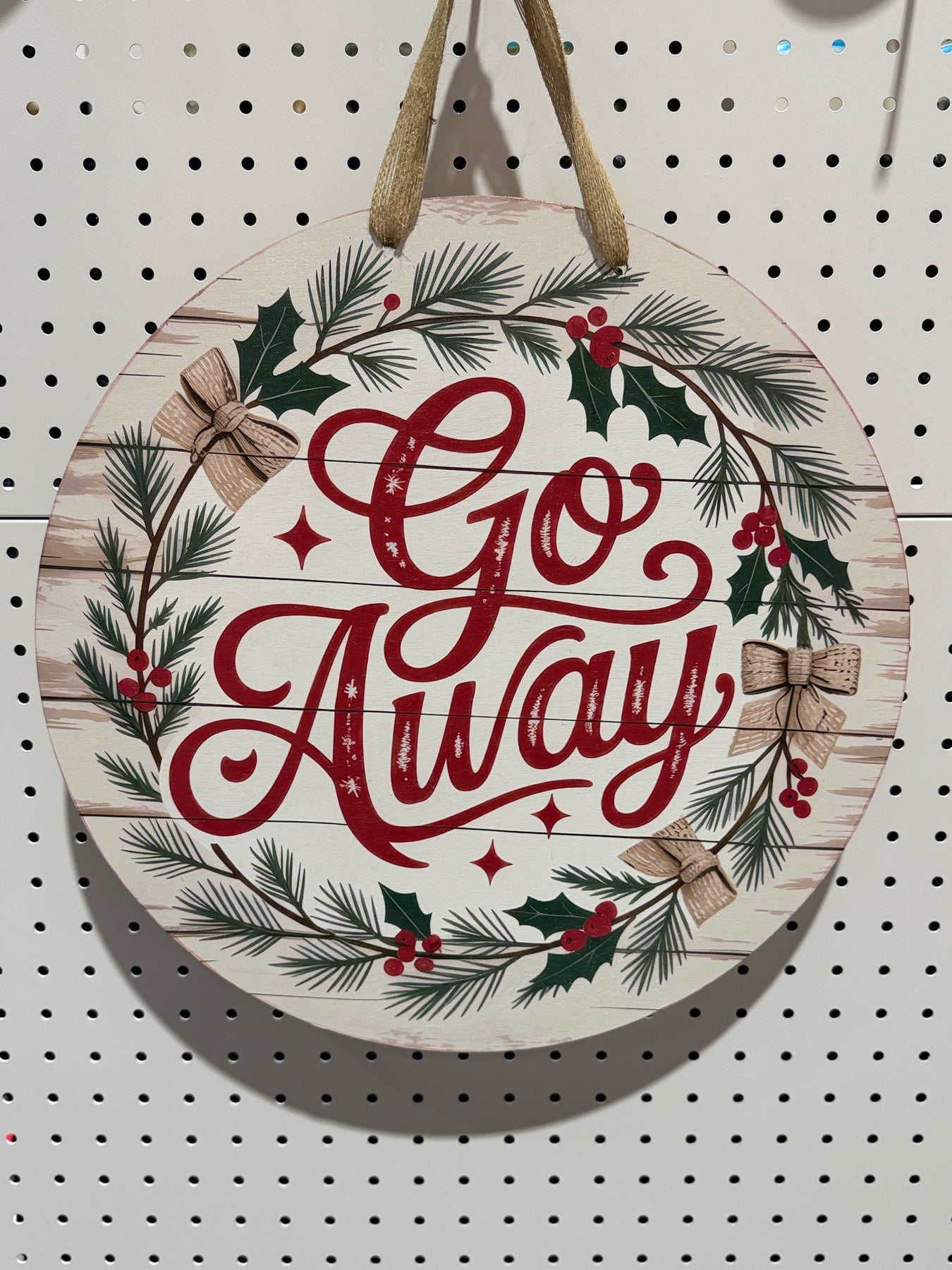 Funny “Go Away” Front Door Sign Give your guests (or delivery drivers) a good laugh before they even knock. This cheeky sign says what we’re all thinking sometimes — with just enough holiday charm to get away with it.